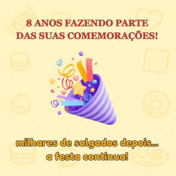 A Cah Salgados e Doces está há 8 anos levando alegria, sabor e qualidade para as festas, encontros e momentos especiais de centenas de clientes em Sorocaba.Foram anos de aprendizado, dedicação e muito amor em cada salgado e doce preparado. E tudo isso só foi possível graças a você, que confia no nosso trabalho e nos permite fazer parte da sua história. 💛🙏 Nosso maior presente é ver cada cliente satisfeito e cada evento ainda mais completo com nossas delícias.Que venham muitos outros anos recheados de conquistas e gratidão!